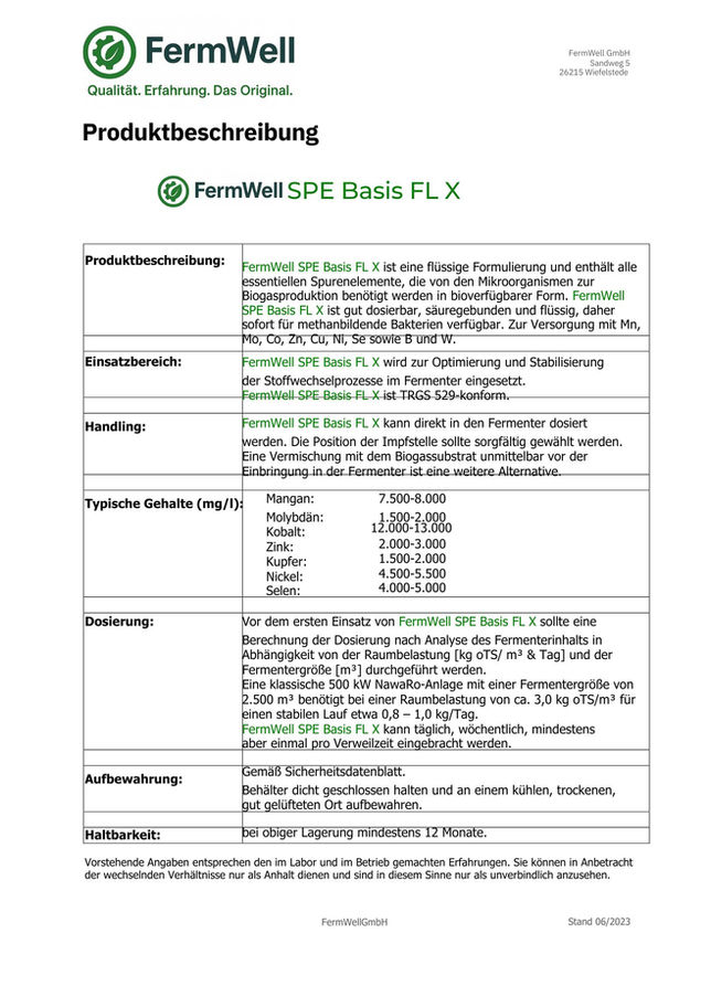 Das Produkt FermWell® SPE Basis FL-X ist als Lösung von Spurenelementen hoch bioverfügbar. Zur Versorgung mit Bor, Mangan, Kobalt, Zink, Kupfer, Nickel, Molybdän, Selen, und Wolfram.