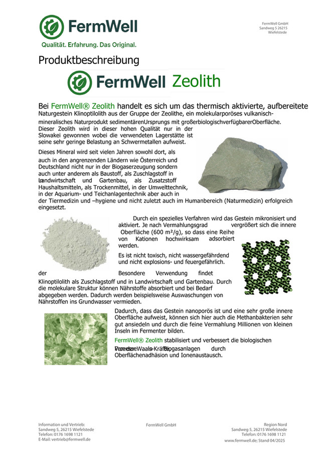 Bei FermWell® Zeolith 50 handelt es sich um das fein vermahlene und thermisch aktivierte Naturgestein Klinoptilolith. Die große verfügbare Oberläche ermöglicht eine sehr gute Anhaftung von Kationen wie Ammonium (NH4+) und dient als ideale Aufwuchsfläche für Mikroorganismen wie z.B. Methanbakterien. Unser Zeolith sorgt im Fermenter für eine verbesserte biologische Aktivität und Viskosität.Bei suboptimal eingestellten Anlagen mit hoher Faulraumbelastung führt die verbesserte biologische Aktivität auch zu Ertragssteigerungen im Biogas. Unser Zeolith kann Ammonium wirkunksvoll binden und führt zu einer geringeren Ammoniumtoxizität, geringeren Ammoniakemissionenund Stickstoffverlusten, auch bei offener Lagerung und bei der Ausbringung auf landwirtschaftlicher Fläche.